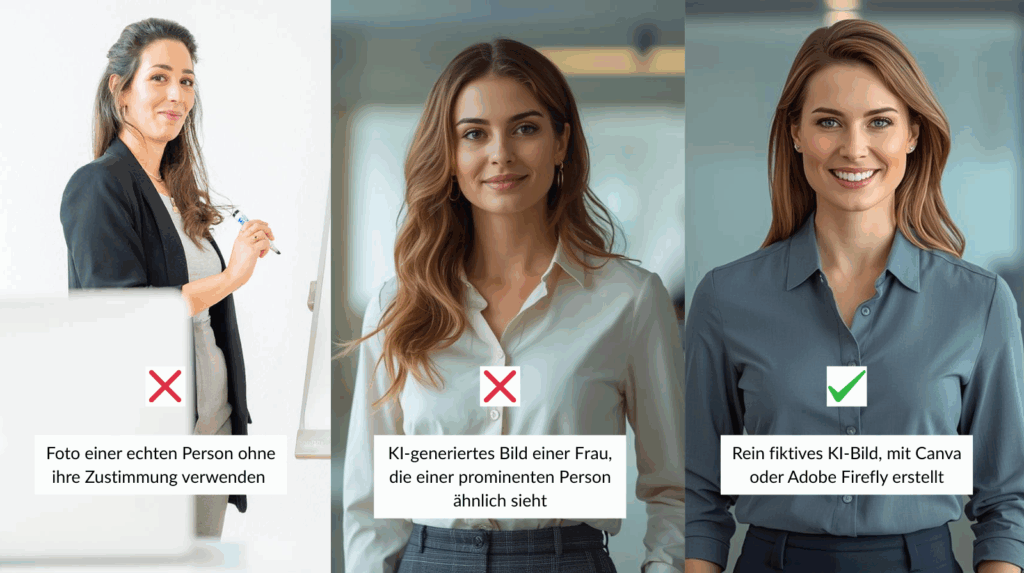 Echte Personen dürfen nicht ohne Zustimmung dargestellt werden. Das gilt auch für KI-Bilder, die ihnen stark ähneln.