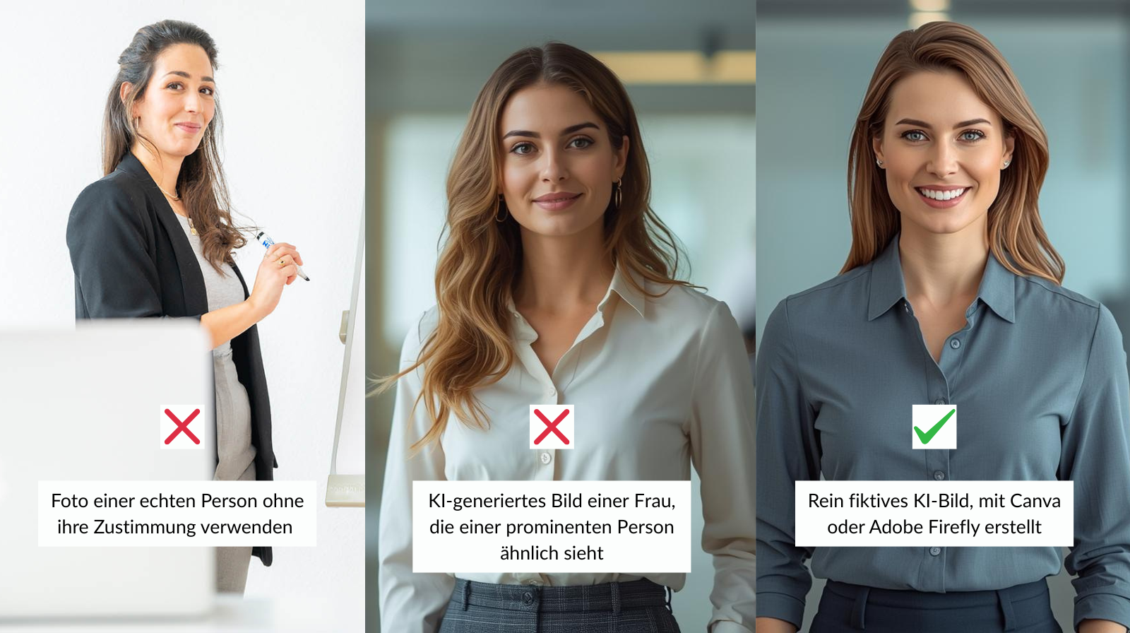 • Nutzen Sie Tools, die klarstellen, dass die generierten Gesichter rein fiktiv sind (z.B. Canva und Adobe Firefly).