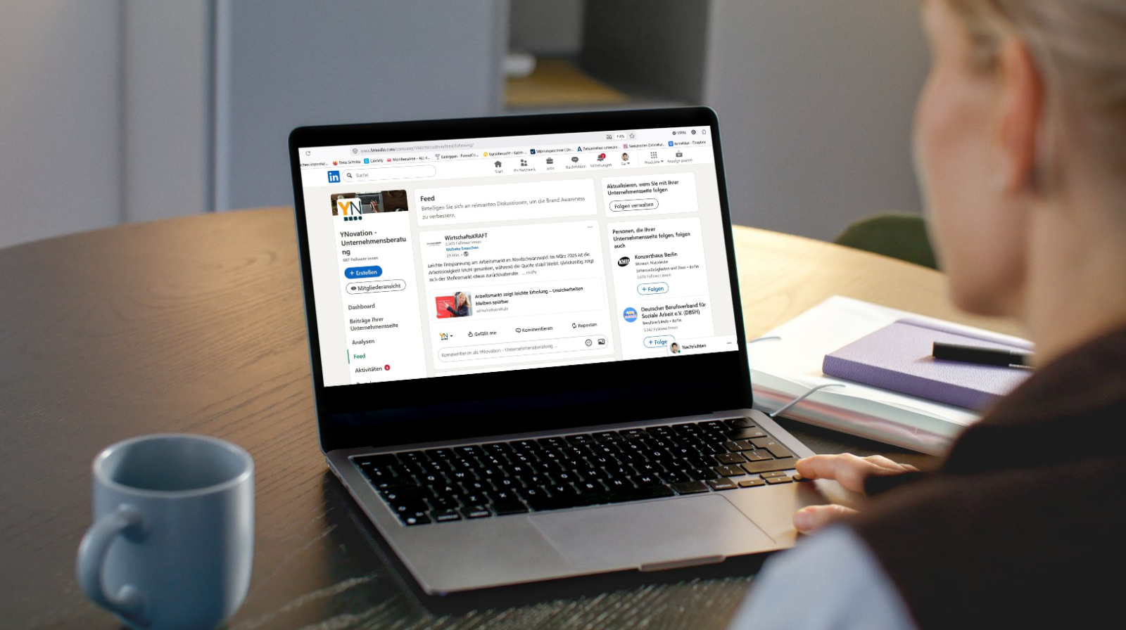 Eine Frau schaut auf einen Laptop. Auf dem Bildschirm ist LinkedIn geöffnet.
