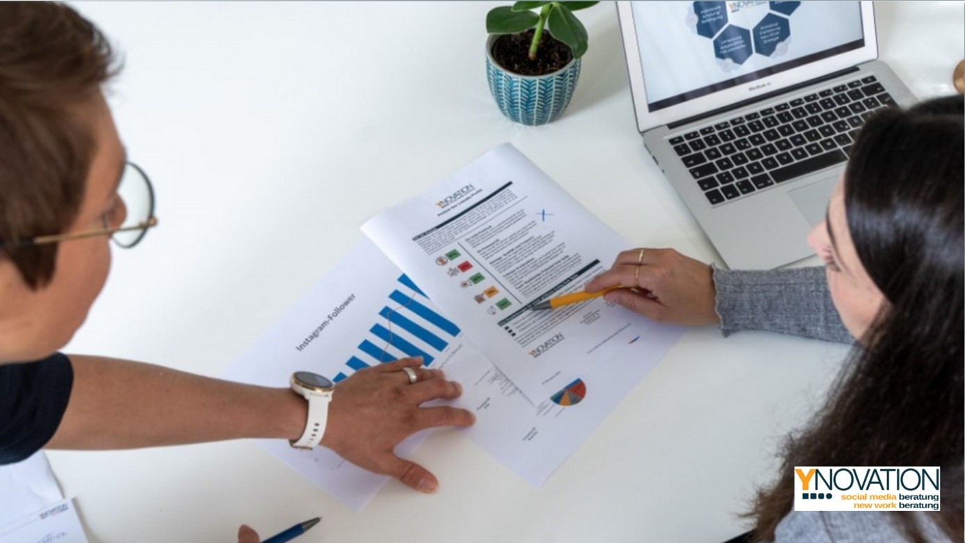 Zwei Frauen schauen auf ausgedruckte Social-Media-Analysen
