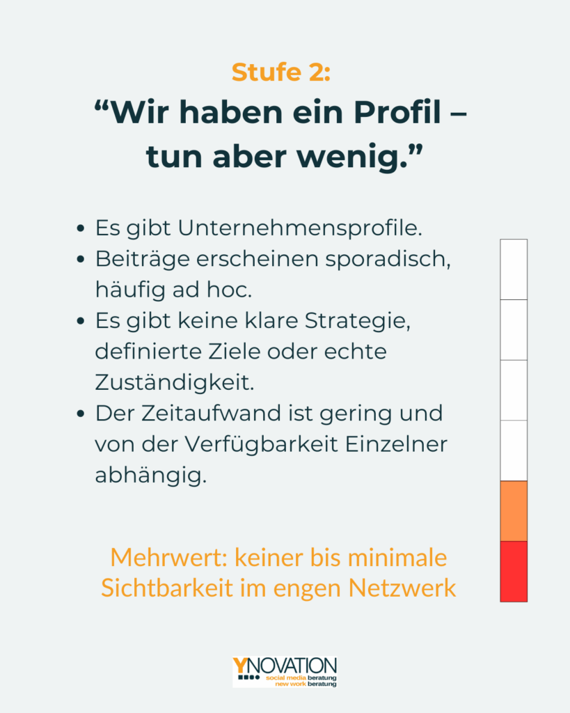 Ein klassisches Stufe-1-Unternehmen ist zum Beispiel ein Metallbauer mit 25 Mitarbeitenden: Die Website ist acht Jahre alt, eine Facebook-Seite existiert theoretisch, wird aber seit Jahren nicht gepflegt. Auf LinkedIn gibt es einzelne Profile der Geschäftsführung, aber keine Unternehmensseite. Social Media ist kein fester Tagesordnungspunkt, sondern ein „Darum kümmern wir uns, wenn mal Zeit ist“-Thema.