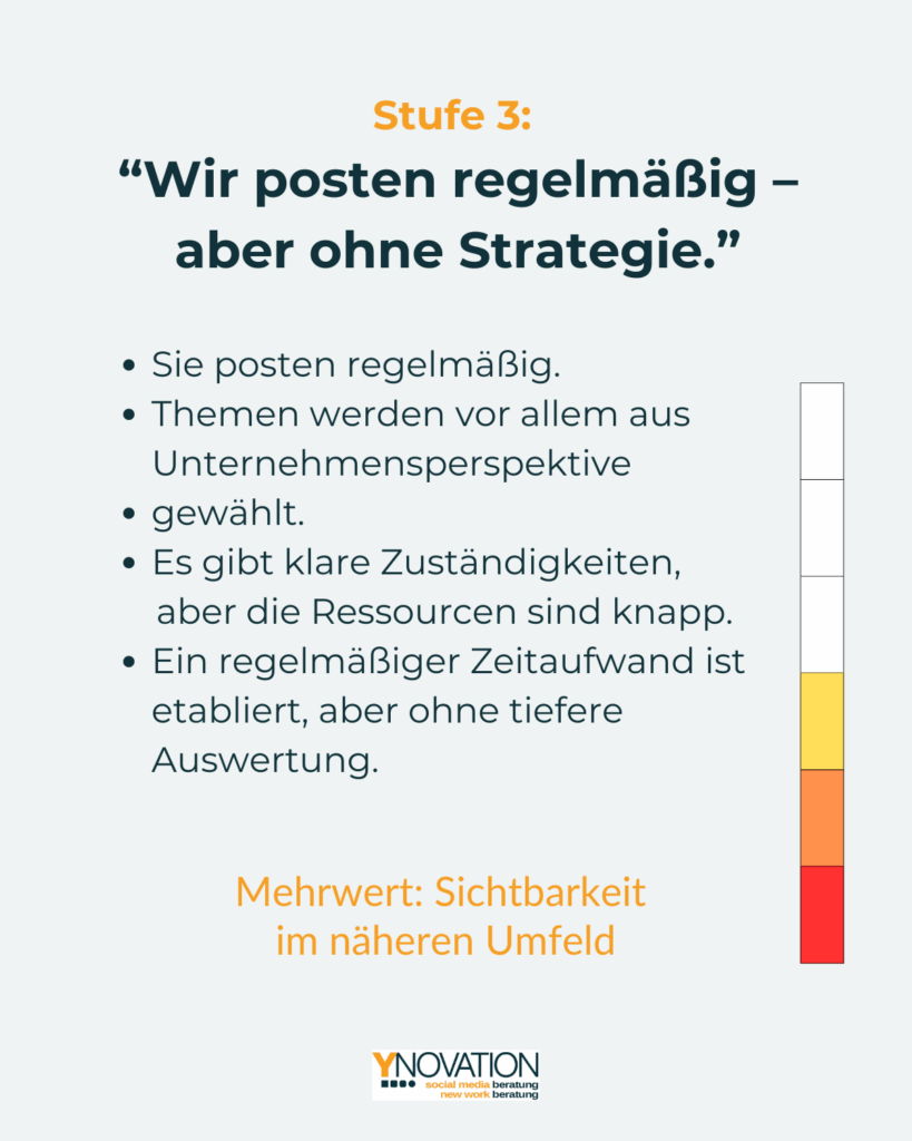 Ein Unternehmen auf Stufe 3 postet zum Beispiel einmal pro Woche Neuigkeiten: neue Maschine, neuer Kunde, neues Zertifikat. Die Inhalte sind sauber und professionell, drehen sich aber fast ausschließlich um das Unternehmen selbst – nicht um die Fragen oder Probleme der Zielgruppe.