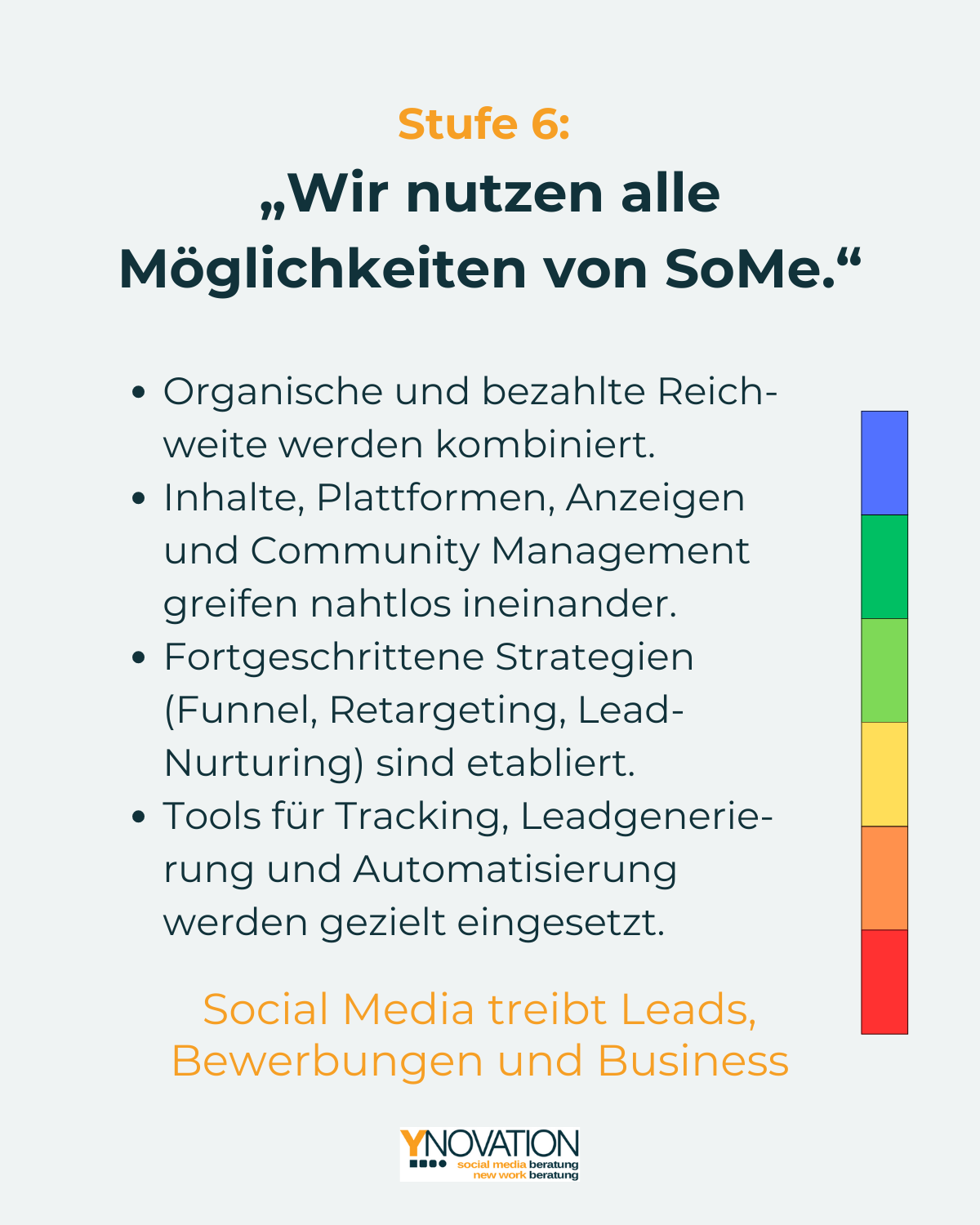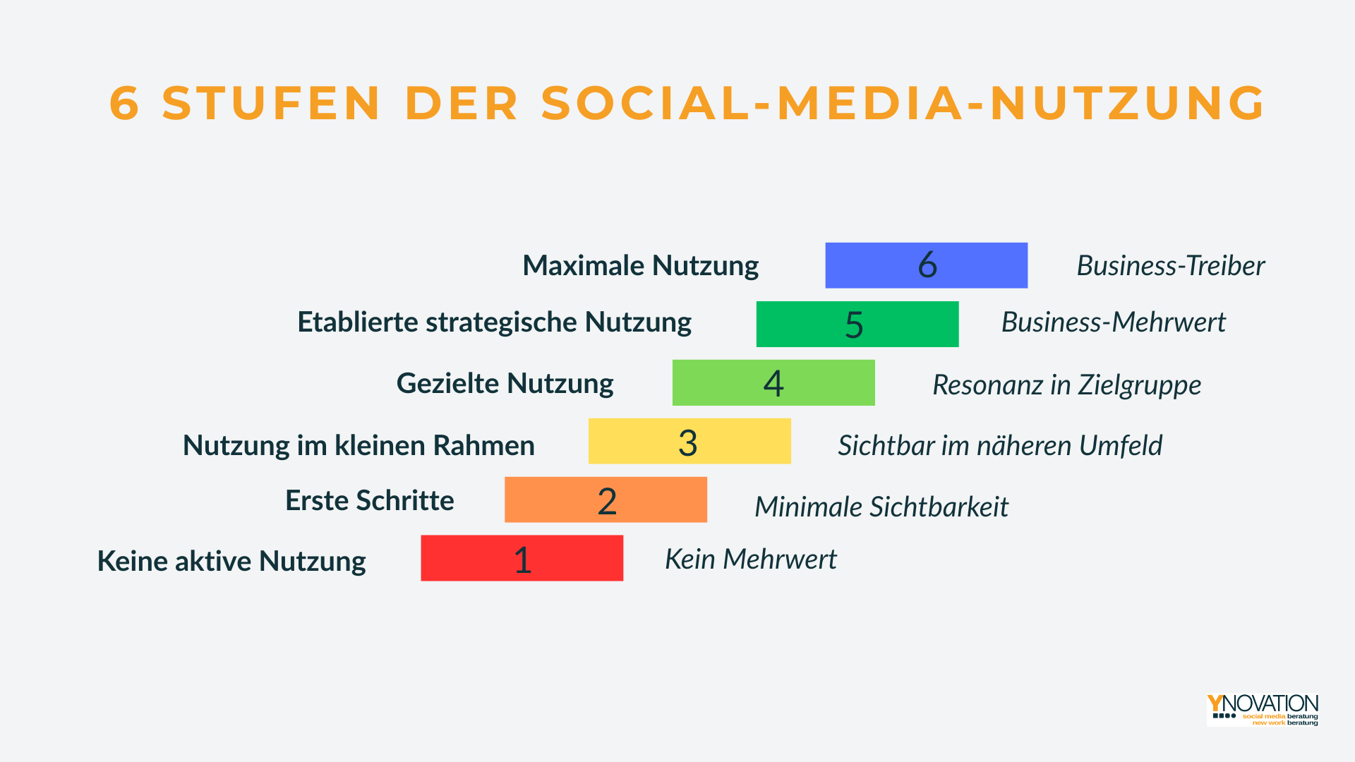 Wichtig: Nicht jedes mittelständische Unternehmen muss Stufe 6 erreichen. Entscheidend ist, dass Ihre Social-Media-Aktivitäten zu Ihrer Größe, Ihren Ressourcen und Zielen passen.
